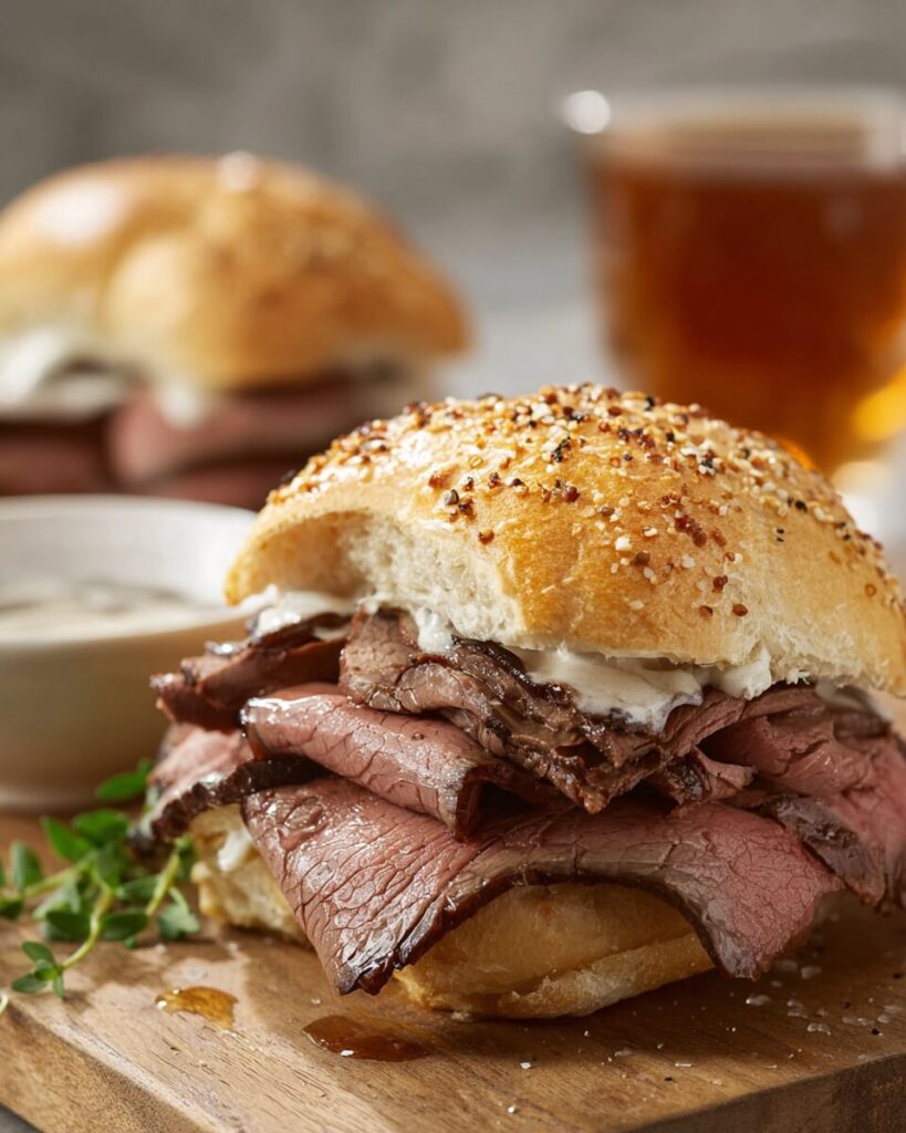 Classic Beef on Weck Sandwich (Tender Roast Beef with Kummelweck Rolls & Au Jus)