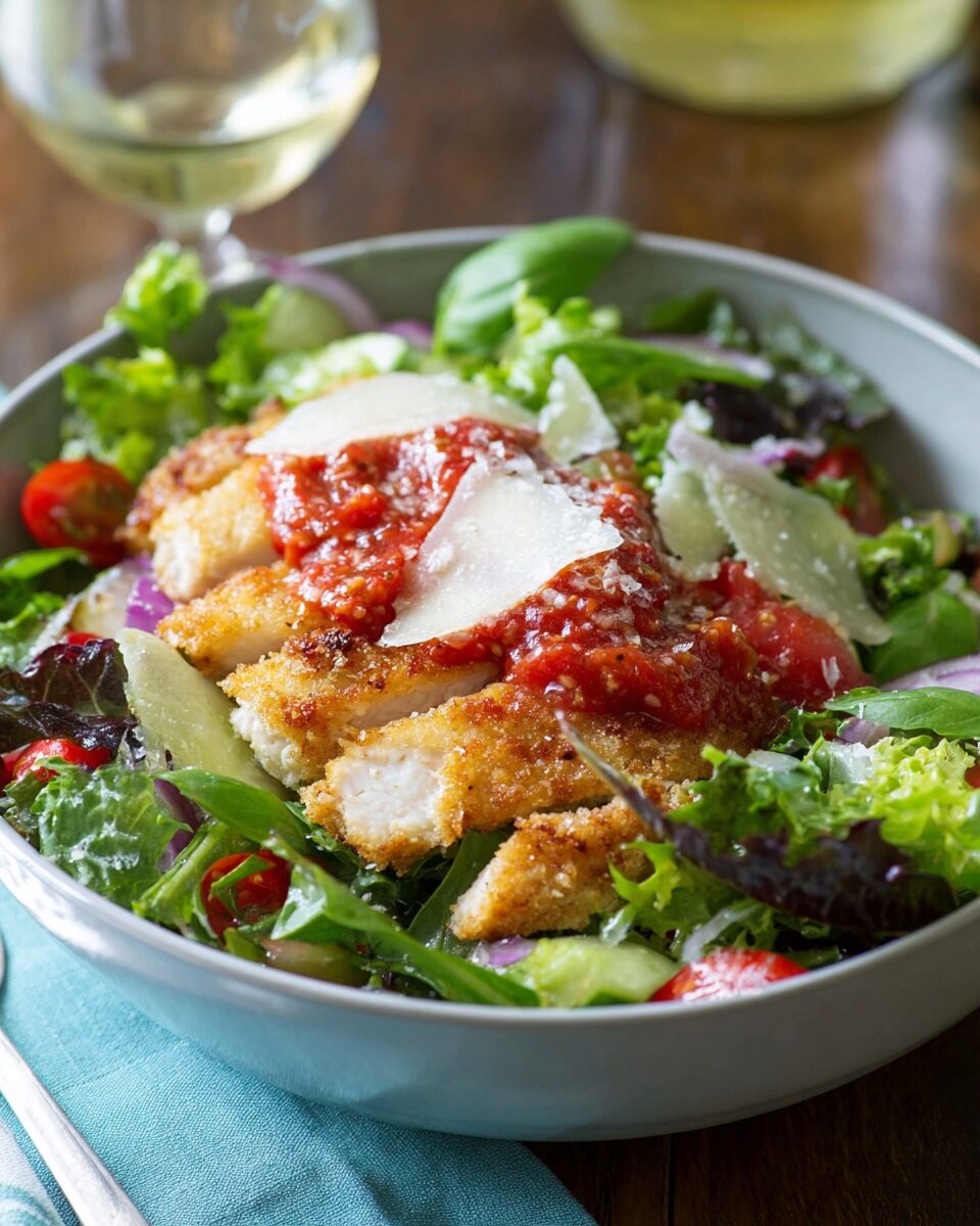 This recipe is not just a clever twist on a favorite; it’s a celebration of balance. It has all the satisfying crunch, savory richness, and bright tanginess you love from traditional Chicken Parmesan, but it’s served atop a bed of vibrant greens with a light homemade tomato sauce rather than heavy marinara. Each bite is a contrast of temperatures and textures — warm, juicy chicken with cool, crisp lettuce, ripe tomatoes, and fragrant basil.