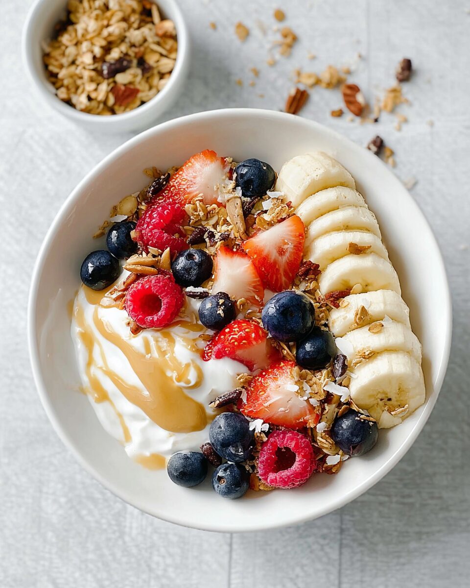 There’s something almost childlike about eating it — a reminder that food should make us feel good, not just full. Each spoonful is a balance of creamy, crunchy, sweet, and tangy. The banana is smooth and mellow, the yogurt adds creaminess and a touch of tartness, the granola brings texture and warmth, and the berries or toppings add bursts of freshness. It’s a harmony of flavors that satisfies your taste buds while providing fiber, protein, and antioxidants — all before your first cup of coffee is done.